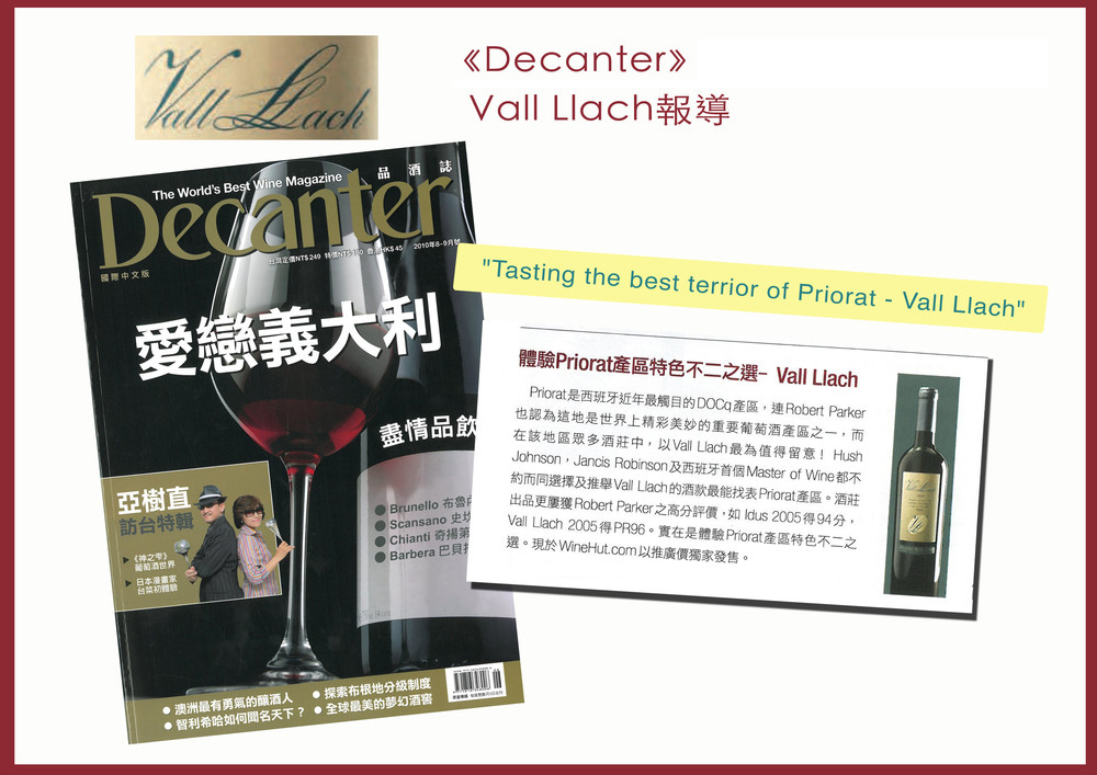 酒莊出品的酒款更屢獲 Robert Parker 之高分評價, 如 Idus 2005得94分,Vall Llach 2005 得 PR96。實在是體驗 Priorat 產區特色不二之選。